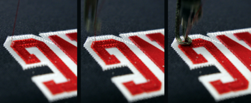 Tackle twill is specialized decoration, not for every order, but it certainly adds more than traditional screenprinting or embroidery would. The process takes precut designs and lettering, and sews them onto the shirt. It’s great for baseball jerseys, cheer uniforms, or if you want to bring your next sweatshirt order up a notch.